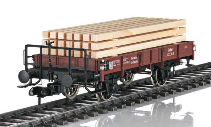 Das war in den 1920er Jahren oft die einzige Möglichkeit Material über längere Strecken transportieren zu können. Der Niederbordwagen der Gattung X "Erfurt" mit der Nummer 47238 transportiert lange Holzbalken zur nächsten Baustelle. Die Balken aus echtem Holz sind als Stapel fixiert. Mit der filigranen Bremserbühne und den feinen Speichenrädern ist dieser Wagen ein hübsche Ergänzung für jeden Epoche II Güterzug.
